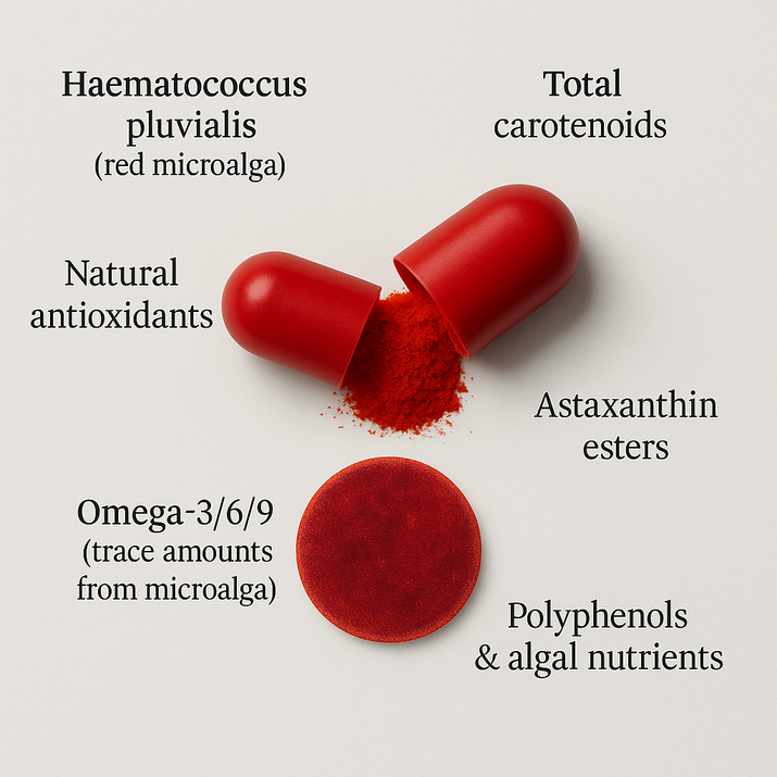 Axtalya contains pure Haematococcus pluvialis microalgae, naturally rich in astaxanthin, carotenoids, antioxidants, and trace omega nutrients. This concentrated blend supports cellular protection, youthful-looking skin, and overall vitality.